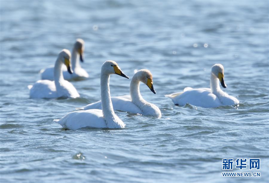 10月15日,大天鹅在荣成大天鹅国家级自然保护区天鹅湖景区游弋。 新华社记者 李紫恒 摄