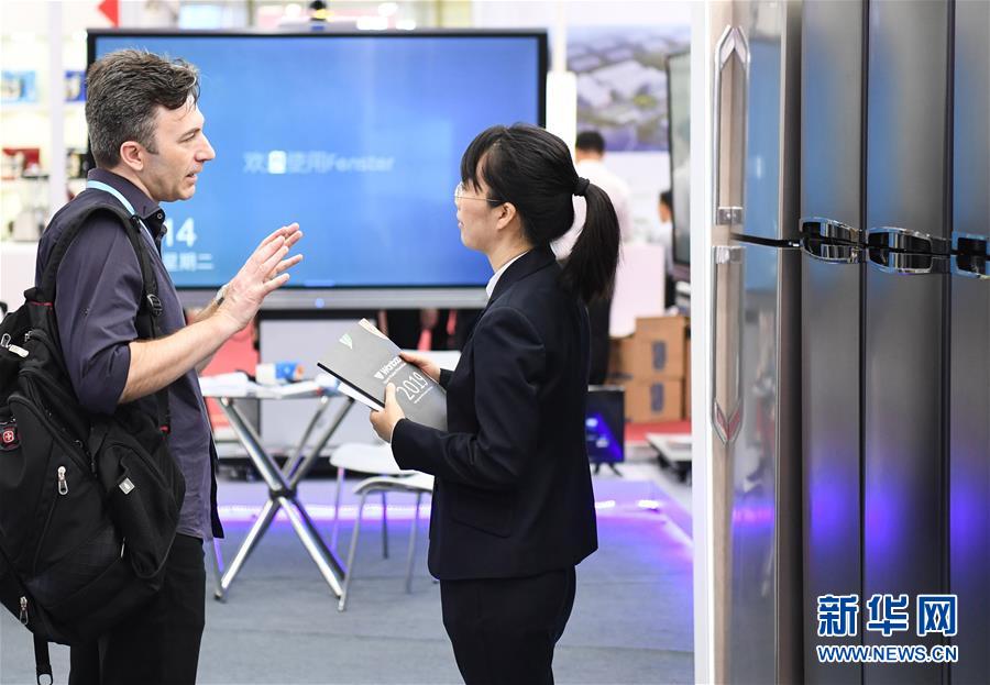 10月15日,采购商(左)与参展商在家用电器展台前洽谈。 当日,第126届中国进出口商品交易会(广交会)在广州开幕。本届广交会展览总面积118.5万平方米,展位总数60676个,境内外参展企业25642家。 新华社记者 邓华 摄