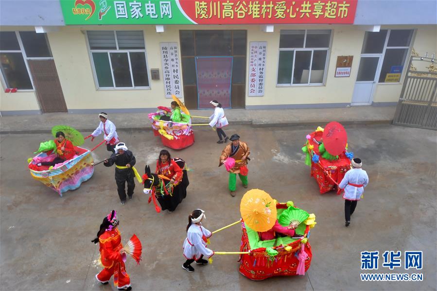 在夺火乡高谷堆村,村民在排练传统民俗节目“推小车”(10月14日摄)。 新华社记者 曹阳 摄