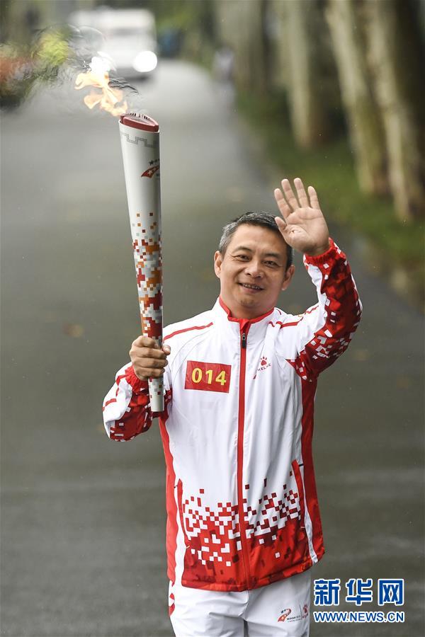10月16日,第14名火炬手李小双在传递火炬。 当日,第七届世界军人运动会火炬传递活动在武汉东湖绿道举行。 新华社发(尹棣摄)