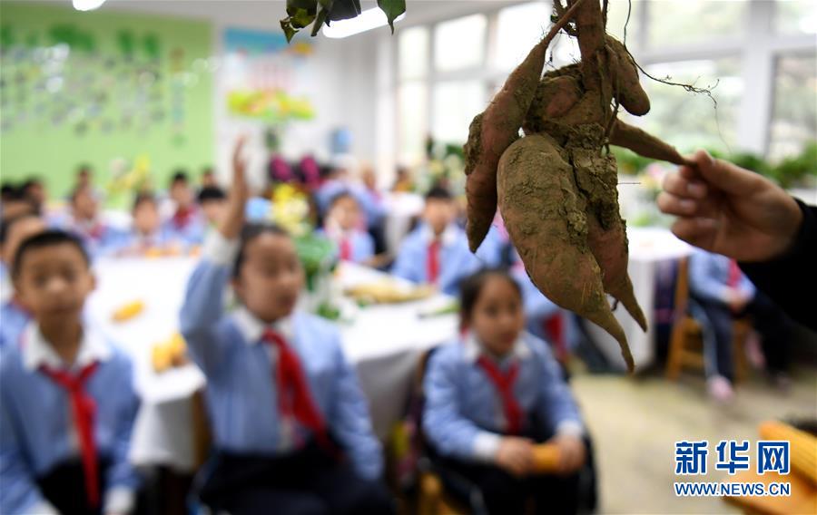 10月16日,石家庄市桥西外国语小学学生在学习辨识粮食。新华社发(梁子栋摄)