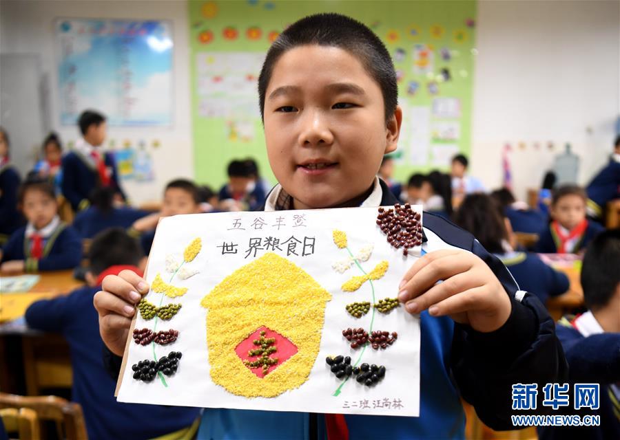 10月16日,石家庄市桥西外国语小学的孩子在展示五谷杂粮拼成的“粮食贴画”。新华社记者 王晓 摄