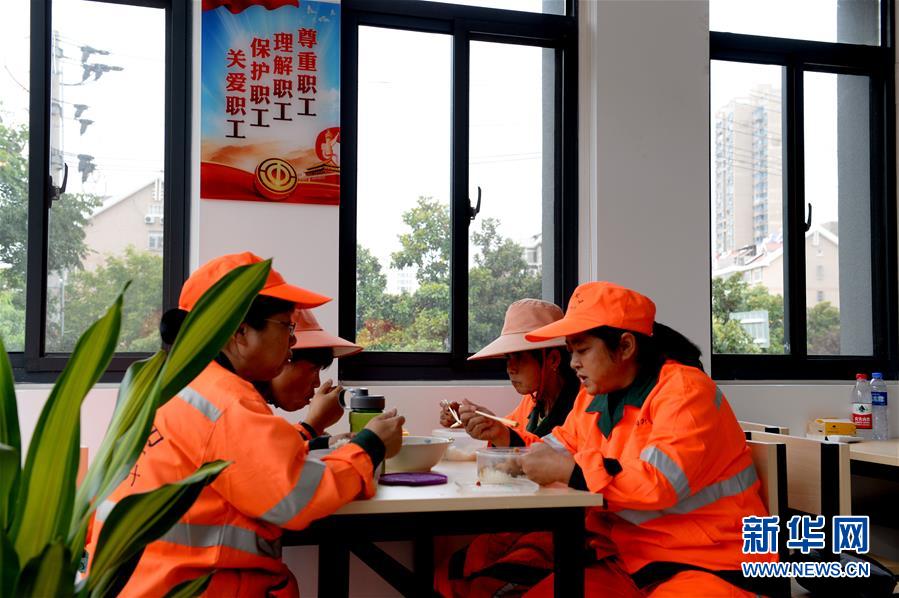 10月16日,环卫工人在“幸福驿站”食堂内吃午饭。 新华社发(黄博涵摄)