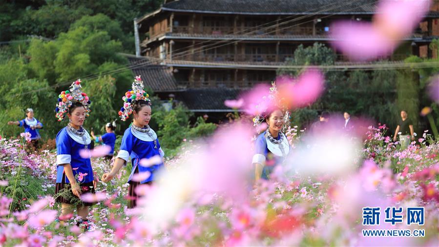 10月15日,在三江侗族自治县程阳八寨,侗族群众在格桑花海中游玩。 连日来,广西三江侗族自治县程阳八寨种植的格桑花竞相开放,吸引众多游客前来赏花观景。 新华社记者 薛东梅 摄