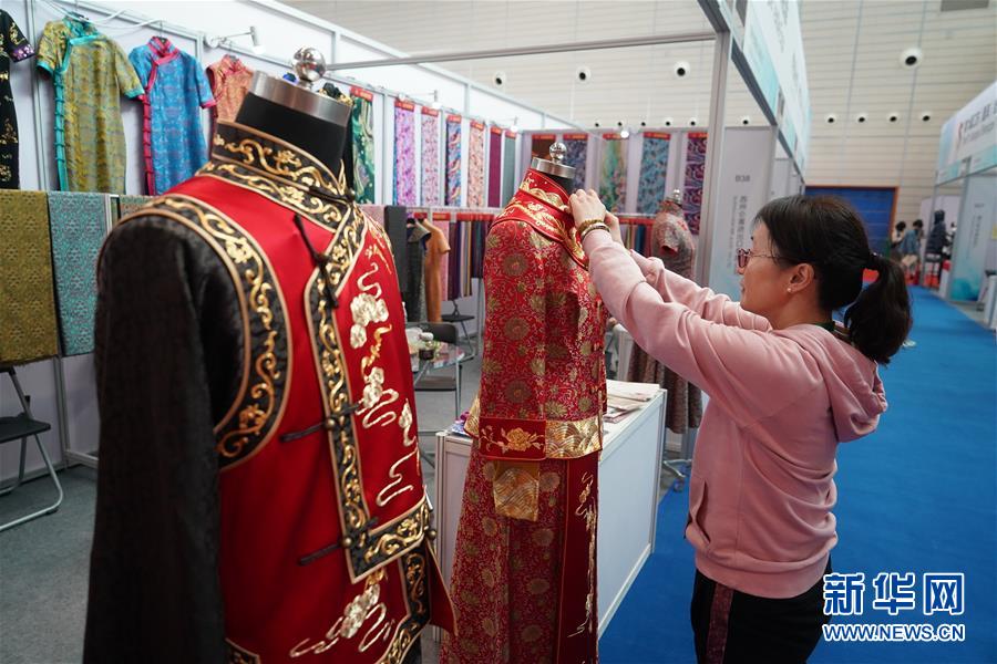 10月16日,在第六届江苏(盛泽)纺博会上,参展商在整理传统婚礼礼服。新华社记者 季春鹏 摄