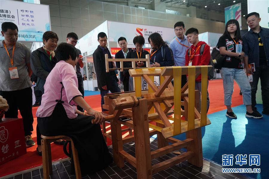 10月16日,在第六届江苏(盛泽)纺博会上,一名工作人员展示用传统手工方式“抽丝剥茧”。新华社记者 季春鹏 摄