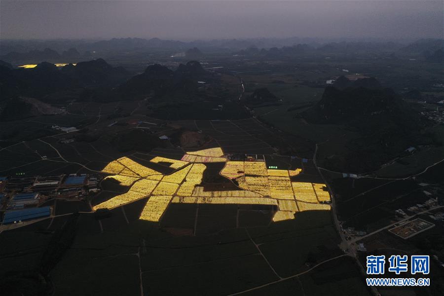 广西隆安县一处安装有灯光补给系统的火龙果种植基地在夜晚点亮补给灯(10月15日无人机拍摄)。新华社记者 曹祎铭 摄