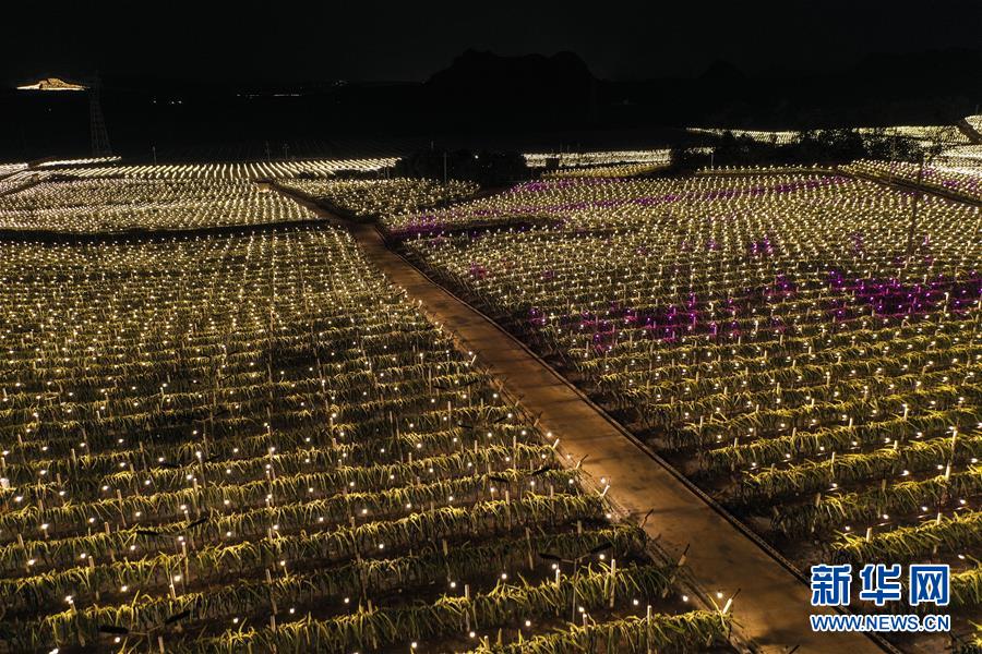 广西隆安县一处安装有灯光补给系统的火龙果种植基地在夜晚点亮补给灯(10月15日无人机拍摄)。新华社记者 曹祎铭 摄