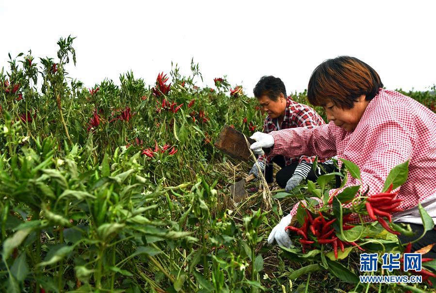 10月16日,宝丰县闹店镇周营村的村民在抢收辣椒。 当日,河南省宝丰县迎来晴好天气,闹店镇周营村的村民抓紧时间抢收抢晒“订单辣椒”,以确保品质。近年来,宝丰县闹店镇因地制宜发展辣椒种植业,村民收获的辣椒通过订单销售的方式销往外地,带动当地农户尤其是贫困户增收。 新华社记者 李嘉南 摄