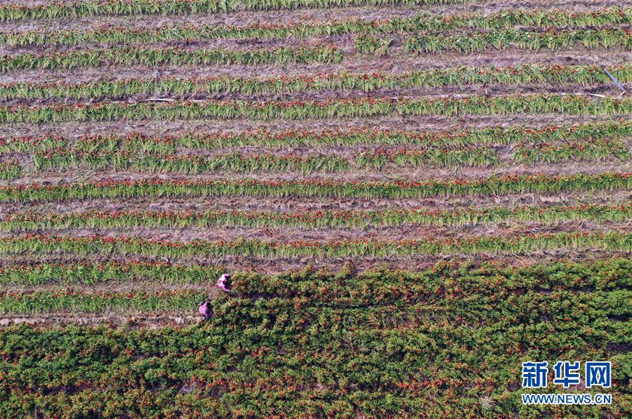 10月16日,宝丰县闹店镇周营村的村民在抢收辣椒(无人机拍摄)。 当日,河南省宝丰县迎来晴好天气,闹店镇周营村的村民抓紧时间抢收抢晒“订单辣椒”,以确保品质。近年来,宝丰县闹店镇因地制宜发展辣椒种植业,村民收获的辣椒通过订单销售的方式销往外地,带动当地农户尤其是贫困户增收。 新华社记者 李嘉南 摄
