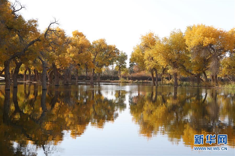 这是在内蒙古自治区额济纳旗拍摄的胡杨林(10月16日摄)。 金秋时节,位于内蒙古阿拉善盟额济纳旗境内的胡杨林披上了金黄色的外衣,在阳光的照射下呈现绚丽夺目的色彩,成为沙漠深处的一抹亮色。 新华社记者 丁洪法 摄