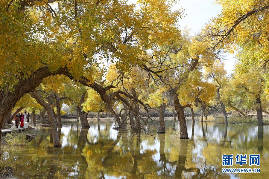 这是在内蒙古自治区额济纳旗拍摄的胡杨林(10月16日摄)。 金秋时节,位于内蒙古阿拉善盟额济纳旗境内的胡杨林披上了金黄色的外衣,在阳光的照射下呈现绚丽夺目的色彩,成为沙漠深处的一抹亮色。 新华社记者 丁洪法 摄