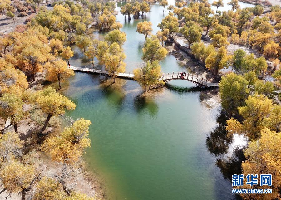 这是在内蒙古自治区额济纳旗拍摄的胡杨林(10月16日无人机拍摄)。 金秋时节,位于内蒙古阿拉善盟额济纳旗境内的胡杨林披上了金黄色的外衣,在阳光的照射下呈现绚丽夺目的色彩,成为沙漠深处的一抹亮色。 新华社记者 丁洪法 摄
