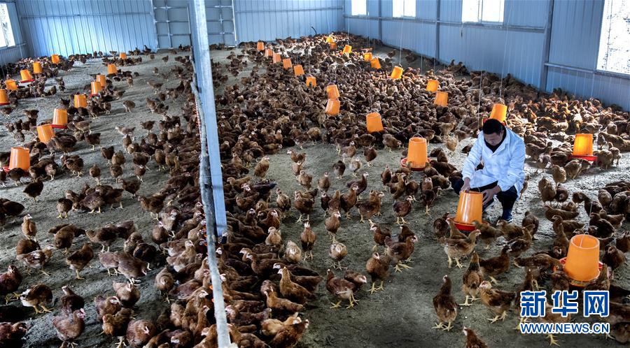 10月16日,洛南县四皓街道办党沟村村民在股份经济联合社养鸡基地喂鸡。 新华社记者 陶明 摄