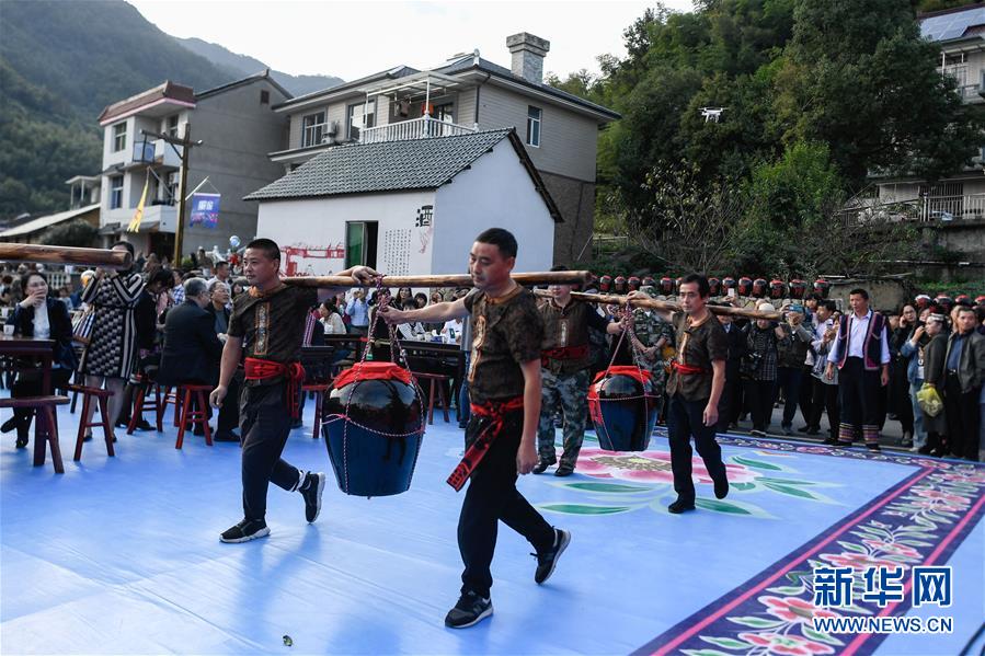 10月16日,在龙峰民族村举办的开酒节活动中,村民将酿造好的红曲酒扛至长桌宴现场。红曲酒是畲族人传统的酒,每年10月家家户户都要酿酒,并用手工制作的红曲酒招待客人。 当日,浙江省桐庐县莪山畲族乡在龙峰民族村举办第三届红曲酒开酒节,九十余桌宴席沿道路排开,四方宾客和当地村民一起品尝具有畲族特色的“十大碗”长桌宴。 新华社记者 黄宗治 摄