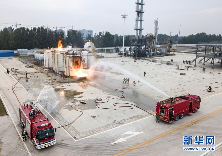 10月16日,在国家危险化学品应急救援(实训)濮阳基地,消防学员在储罐真火实训区进行实战演练(无人机拍摄)。新华社记者 才扬 摄