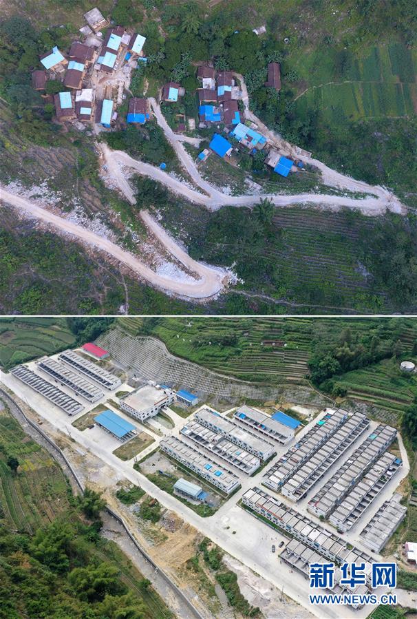 拼版照片:上图为广西都安瑶族自治县三只羊乡建良村龙牙屯(2017年10月11日无人机拍摄)。在脱贫攻坚中,龙牙屯整屯搬迁到三只羊乡可力易地扶贫搬迁安置新区。 下图为广西都安瑶族自治县三只羊乡已经建成入住的可力易地扶贫搬迁安置新区(2019年10月16日无人机拍摄)。 新华社记者陆波岸摄