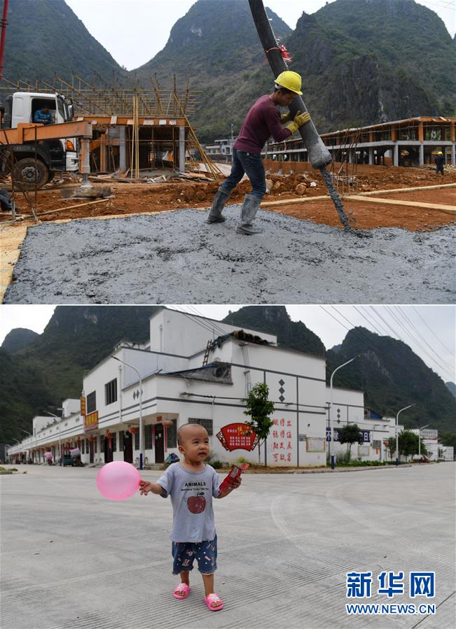 拼版照片:上图为在广西都安瑶族自治县大兴镇,一名工人在施工建设敢皓易地扶贫搬迁安置新区(2017年2月9日摄)。下图为在广西都安瑶族自治县大兴镇敢皓易地扶贫搬迁安置新区,一名入住这里的小朋友在小区内玩耍(2019年10月16日摄)。 新华社记者陆波岸摄