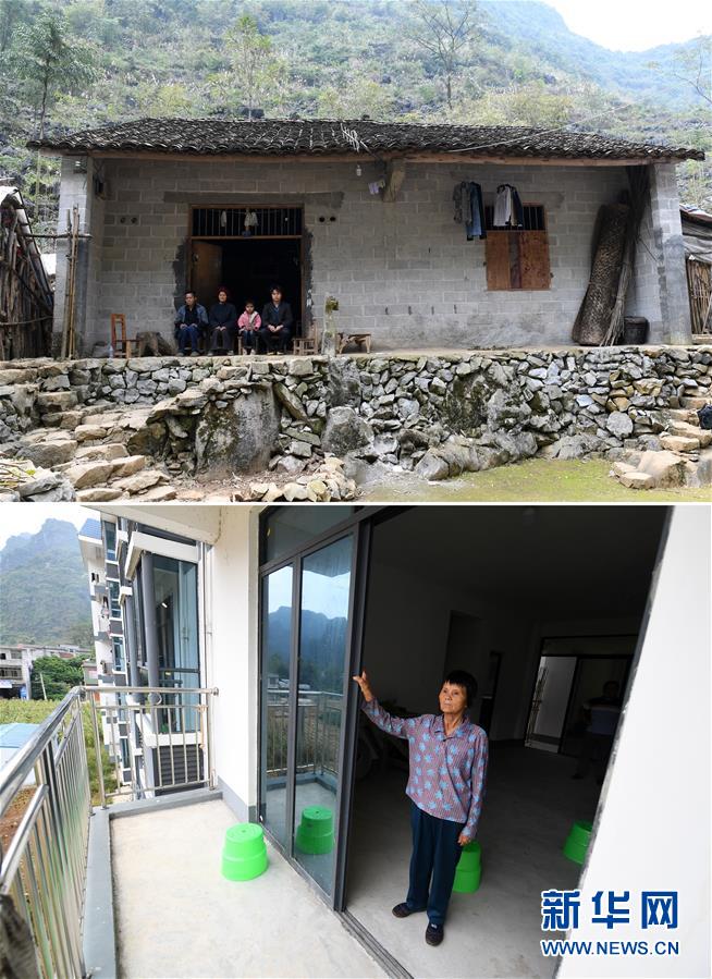 拼版照片:上图为在广西都安瑶族自治县东庙乡三团村弄白屯,村民韦爱文(左二)和家人坐在搬迁前旧住房的门口(2017年2月10日摄)。下图为在广西都安瑶族自治县东庙乡易地扶贫搬迁安置新区,韦爱文站在搬迁后新住房的门口(2019年10月17日摄)。 新华社记者陆波岸摄