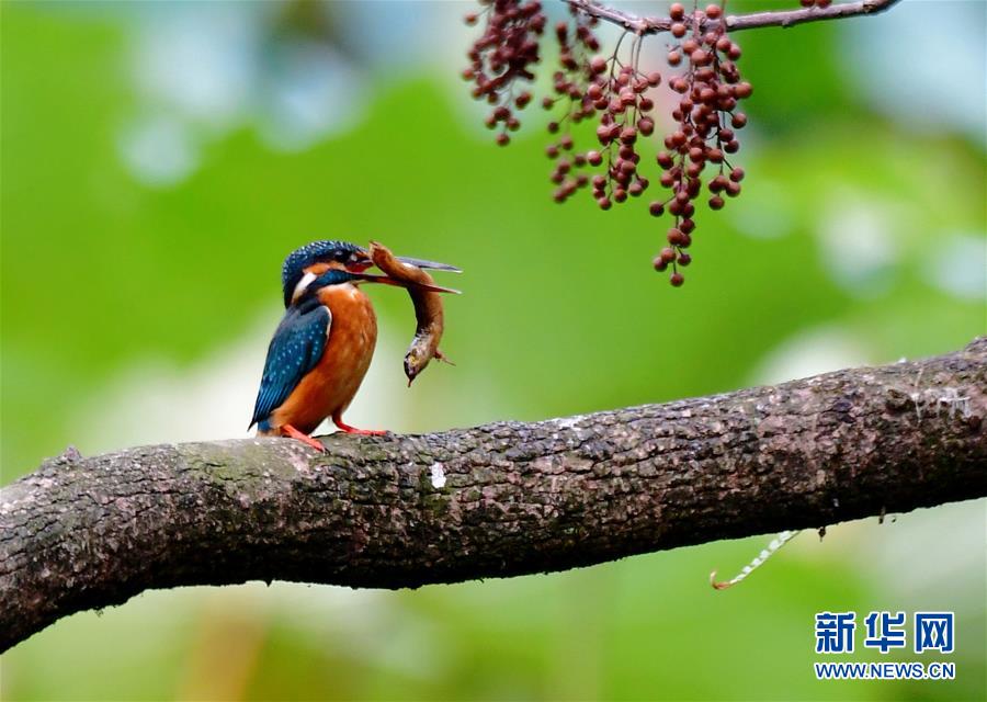10月17日,在福州西湖公园,一只翠鸟捕到泥鳅。 新华社记者 魏培全 摄