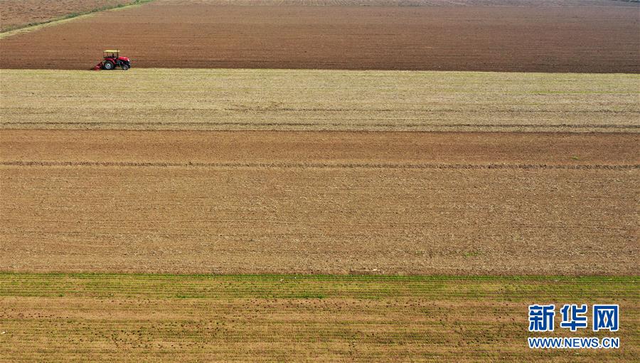 10月17日,在宝丰县赵庄镇周营村,农民在农田里犁地(无人机拍摄)。 近日,河南省宝丰县迎来晴好天气,农民抢抓农时耕种,田间地头一派繁忙景象。 新华社记者 李嘉南 摄