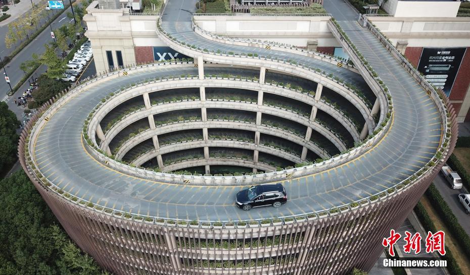 10月17日,航拍浙江杭州一楼顶停车场。近日,该停车场因独特的环形坡道设计在网络走红,市民往返楼顶停车场需绕6圈。 中新社记者 王刚 摄
