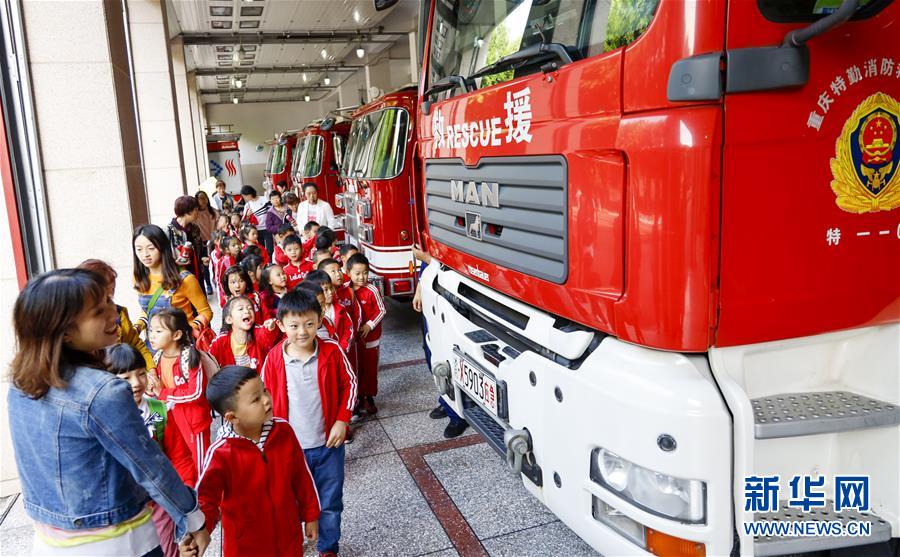 10月18日,小朋友和家长在参观重庆市消防救援总队特勤支队的消防救援车辆。 当日,重庆市龙湖水晶郦城幼儿园组织100余名小朋友及其家长走进重庆市消防救援总队特勤支队开展“萌娃消防体验日”活动。消防队员通过讲解消防救援常识、重大火灾救援故事、灭火器使用等内容,为孩子和家长上了一堂生动的消防安全知识课。 新华社记者 刘潺 摄
