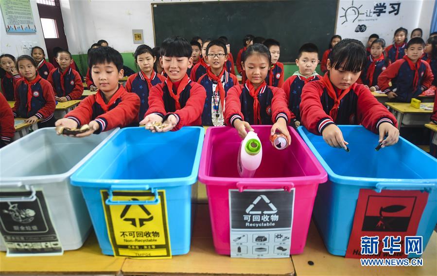 10月18日,河北省廊坊市第十三小学的学生们将各种生活垃圾进行分类。 2019年9月以来,河北省廊坊市广阳区在各中小学开设垃圾分类常识课。学生通过参观演示、互动游戏等形式掌握垃圾分类、回收利用的相关知识,增强环保意识,倡导绿色生活。 新华社记者李晓果摄