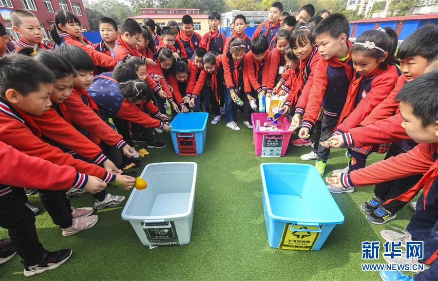10月18日,河北省廊坊市第十三小学的学生们通过趣味游戏的方式学习垃圾分类。 2019年9月以来,河北省廊坊市广阳区在各中小学开设垃圾分类常识课。学生通过参观演示、互动游戏等形式掌握垃圾分类、回收利用的相关知识,增强环保意识,倡导绿色生活。 新华社记者李晓果摄