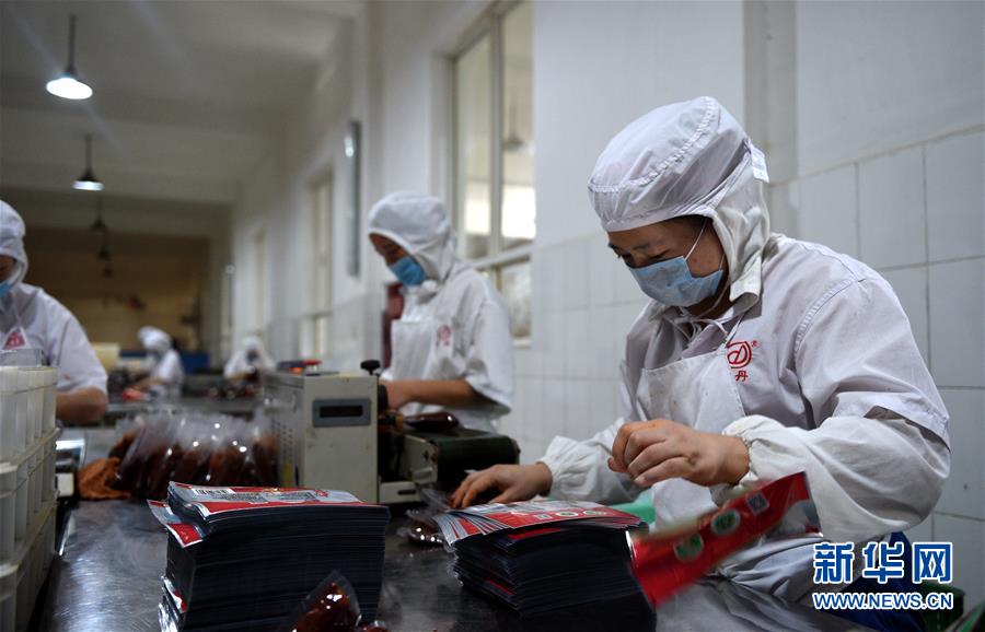 10月18日,在成都市郫都区一家生产企业,工人在包装车间把豆瓣酱装包。 郫县豆瓣是川味食谱中常用的调味佳品,有“川菜之魂”之称。早在2008年,郫县豆瓣传统制作技艺就已列入第二批国家级非物质文化遗产名录。当日,在第七届中国成都国际非物质文化遗产节期间,记者来到成都市郫都区,探访郫县豆瓣的制作过程。目前,郫县豆瓣在郫都区全区证名商标企业有75家,从业人员有1.8万人,年产值超过100亿。 新华社发(王曦摄)