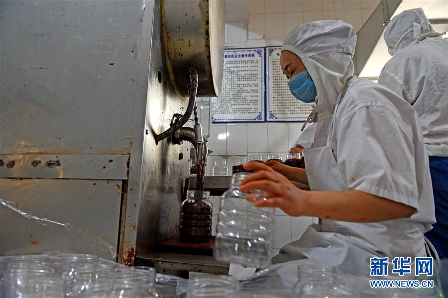 10月18日,在成都市郫都区一家生产企业,工人在包装车间把豆瓣酱装罐。 郫县豆瓣是川味食谱中常用的调味佳品,有“川菜之魂”之称。早在2008年,郫县豆瓣传统制作技艺就已列入第二批国家级非物质文化遗产名录。当日,在第七届中国成都国际非物质文化遗产节期间,记者来到成都市郫都区,探访郫县豆瓣的制作过程。目前,郫县豆瓣在郫都区全区证名商标企业有75家,从业人员有1.8万人,年产值超过100亿。 新华社发(王曦摄)
