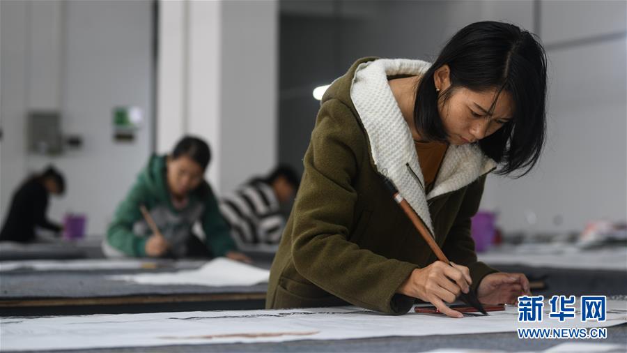 10月18日,在三江侗族自治县的一家“扶贫车间”,来自易地扶贫搬迁点的妇女在学习绘画。 2018年以来,广西三江侗族自治县把易地扶贫搬迁后续就业扶持作为工作重点,把确保搬迁户每户有1人以上稳定就业作为目标。目前,该县引进了9家扶贫工厂建成19个“扶贫微车间”,安排易地搬迁贫困户600多人就业,让搬迁户“搬得出、稳得住、能发展”。 新华社记者 张爱林 摄