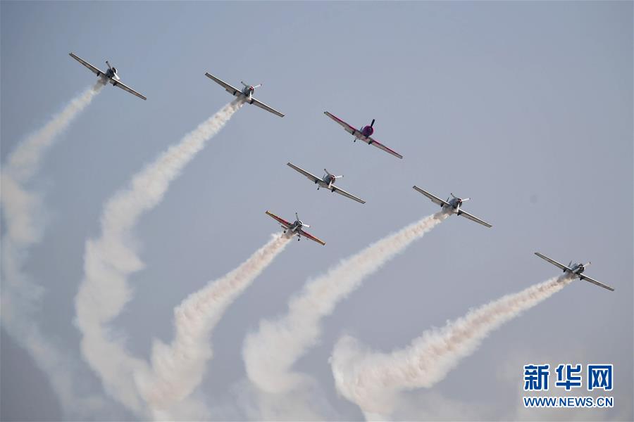 10月18日,由两支飞行表演队合编而成的机队在进行飞行表演。 当日,2019中国国际通用航空大会的飞行表演活动在陕西省渭南市蒲城内府机场举行,43架各类型号的飞行器进行了飞行展示和表演活动。现场同时在地面上举办航空静态展,展出50余架国内外知名型号飞机,吸引近万名观众到场观看。 新华社记者 邵瑞 摄