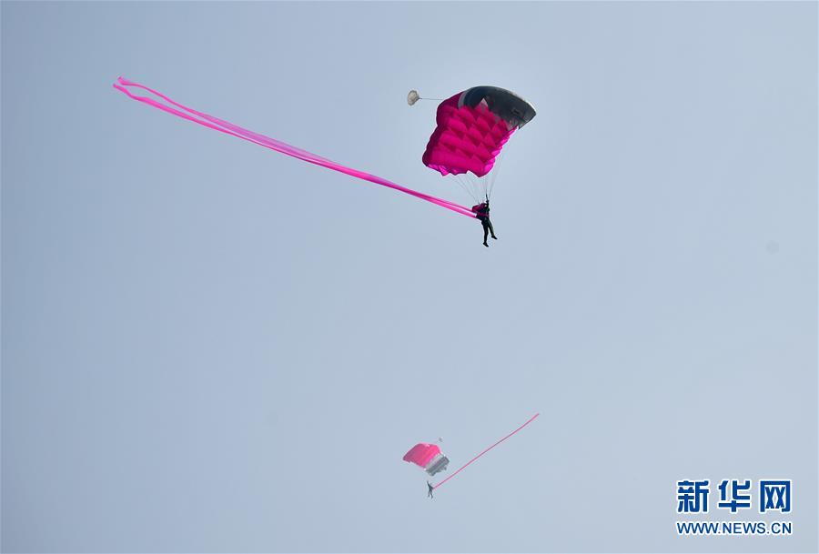10月18日,跳伞运动员进行跳伞表演。 当日,2019中国国际通用航空大会的飞行表演活动在陕西省渭南市蒲城内府机场举行,43架各类型号的飞行器进行了飞行展示和表演活动。现场同时在地面上举办航空静态展,展出50余架国内外知名型号飞机,吸引近万名观众到场观看。 新华社记者 邵瑞 摄