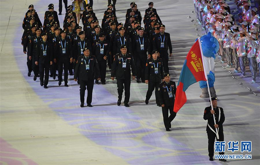 10月18日,蒙古国代表团在开幕式上入场。 当日,第七届世界军人运动会开幕式在武汉体育中心举行。 新华社记者肖艺九摄
