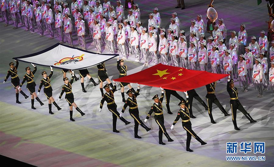 10月18日,护旗手护卫中华人民共和国国旗和国际军事体育理事会会旗进入开幕式现场。 当日,第七届世界军人运动会开幕式在武汉体育中心举行。 新华社记者程敏摄