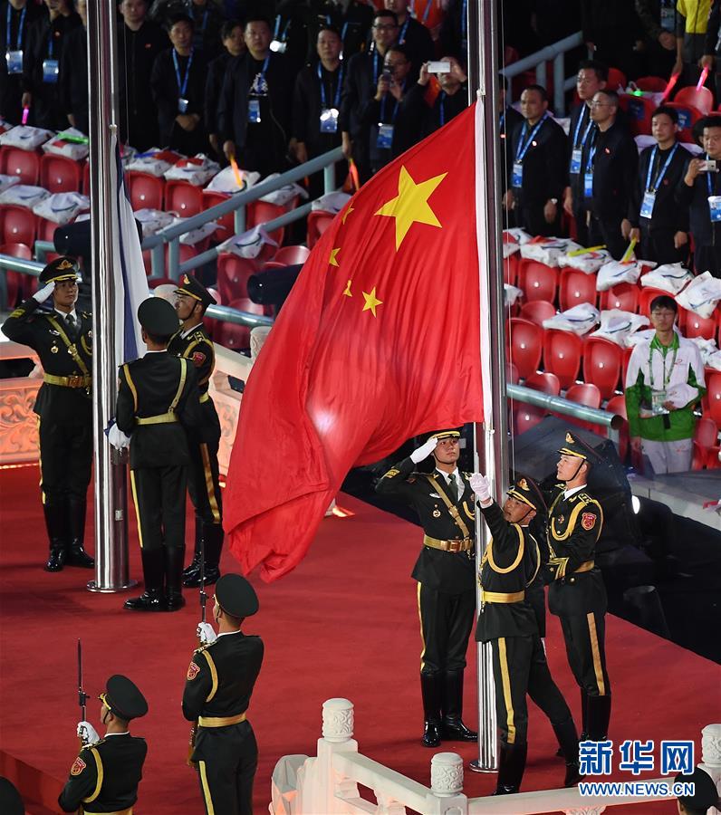 10月18日,旗手在开幕式上升国旗。 当日,第七届世界军人运动会开幕式在武汉体育中心举行。 新华社记者程敏摄