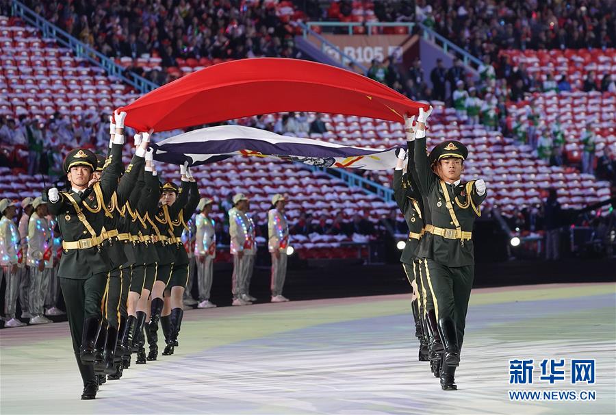 10月18日,护旗手护卫中华人民共和国国旗和国际军事体育理事会会旗进入开幕式现场。 当日,第七届世界军人运动会开幕式在武汉体育中心举行。 新华社记者金良快摄