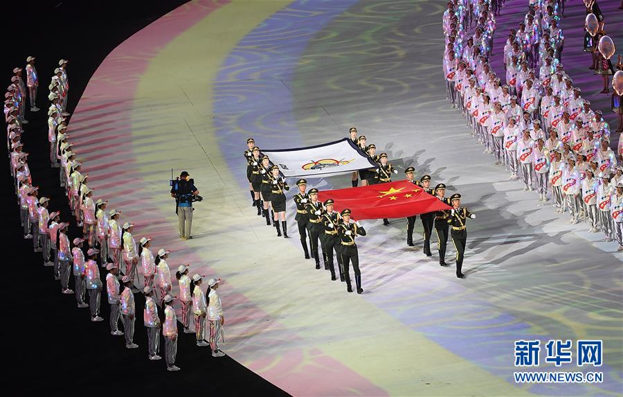 10月18日,护旗手护卫中华人民共和国国旗和国际军事体育理事会会旗进入开幕式现场。 当日,第七届世界军人运动会开幕式在武汉体育中心举行。 新华社记者程敏摄