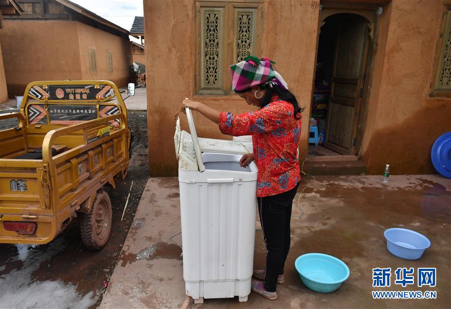 在四川省凉山州昭觉县三河村,一名村民用洗衣机清洗衣物(9月5日摄)。 新华社记者 孙瑞博 摄