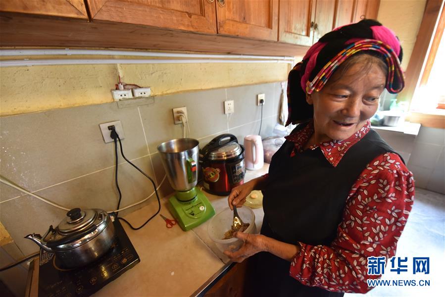 在四川省甘孜州康定市色龙村,村民陈秀芳老人用电动酥油茶机制作酥油茶(9月9日摄)。 新华社记者 孙瑞博 摄