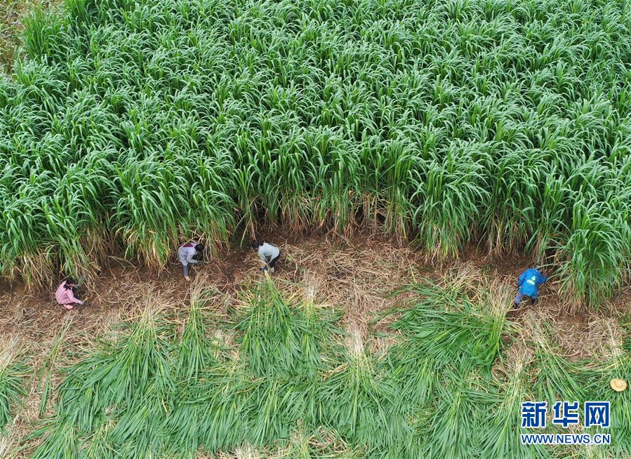 在广西都安瑶族自治县地苏镇右江村,村民在割牧草准备喂牛(10月18日无人机拍摄)。 近年来,广西都安瑶族自治县在脱贫攻坚中,大力实施“粮改饲”工程,同时实施“贷牛还牛”“贷羊还羊”工程,用所种植的牧草饲养牛羊,大力发展绿色生态养殖,被群众称为“绿色车间”的牛羊养殖场遍布乡村,助推乡村绿色发展,帮助群众增收致富。 目前,全县“粮改饲”已超过10万亩,建成3个万头种牛基地、5个万只肉羊基地,成立牛羊合作社247家,形成“县有基地、乡有牛场、村有牛社、户有牛羊”的养殖格局。 新华社记者 陆波岸 摄