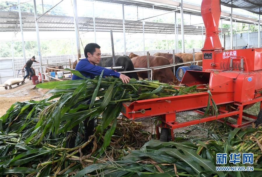 10月18日,在广西都安瑶族自治县龙湾乡内闷村,村民在粉碎牧草准备喂牛。 近年来,广西都安瑶族自治县在脱贫攻坚中,大力实施“粮改饲”工程,同时实施“贷牛还牛”“贷羊还羊”工程,用所种植的牧草饲养牛羊,大力发展绿色生态养殖,被群众称为“绿色车间”的牛羊养殖场遍布乡村,助推乡村绿色发展,帮助群众增收致富。 目前,全县“粮改饲”已超过10万亩,建成3个万头种牛基地、5个万只肉羊基地,成立牛羊合作社247家,形成“县有基地、乡有牛场、村有牛社、户有牛羊”的养殖格局。 新华社记者 陆波岸 摄