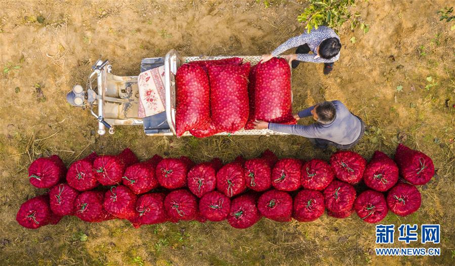 10月20日,武邑县武罗农产品种植专业合作社的农民将收获的山楂装车(无人机拍摄)。 近年来,河北省衡水市武邑县在脱贫攻坚中积极引导农民集中连片发展无公害山楂种植,取得了良好的经济效益。目前,该县已发展山楂种植3000余亩,带动10余个村600余户种植户致富增收。 新华社记者 李晓果 摄