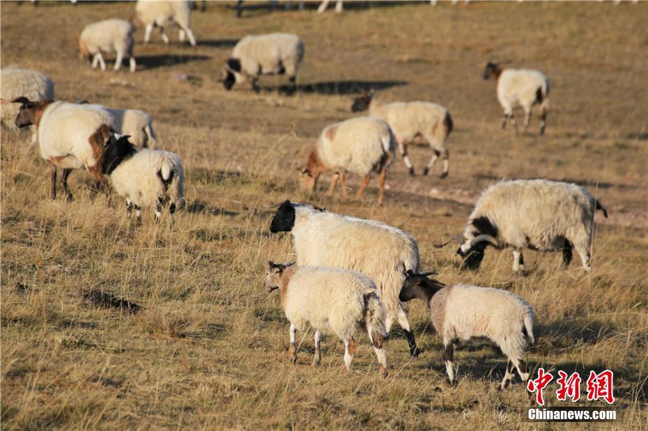 10月20日,甘肃省张掖市山丹马场上,羊群点缀着金黄色的草原,构成了独特的草原秋景。山丹马场地处祁连山冷龙岭北麓,位于河西走廊中部,地势平坦,水草丰美,这里的藏羊,每天至少走1万步,所以有了“万米羊”的称号。史静静 摄