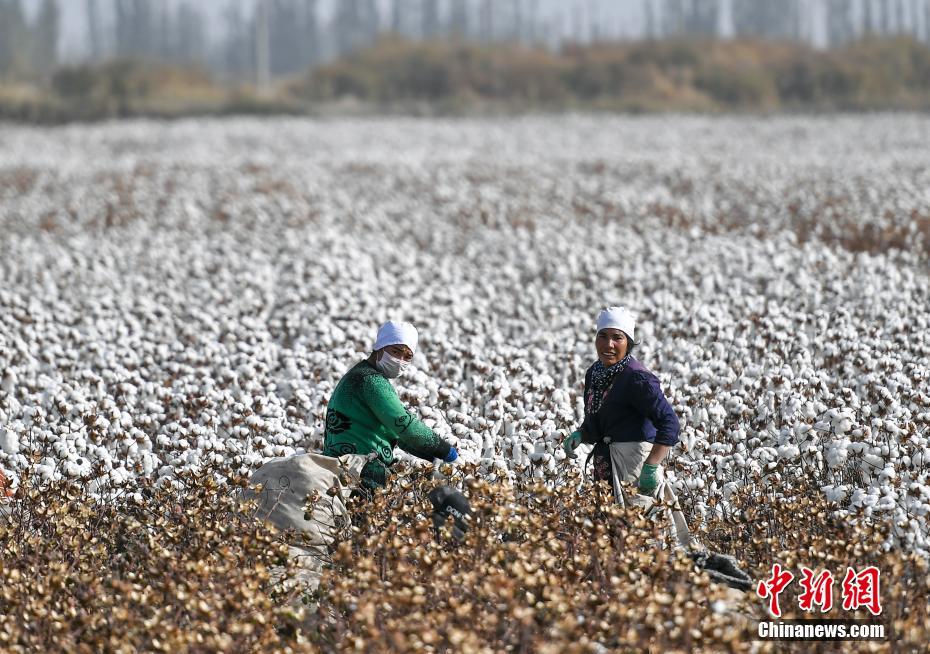 10月21日,新疆沙雅县古勒巴格镇,棉农正在棉田中采摘棉花。金秋时节,新疆迎来棉花采摘旺季。沙雅县是国家级优质商品棉生产基地,2019年棉花种植面积达185万亩,目前已陆续进入采摘期。中新社记者 刘新 摄
