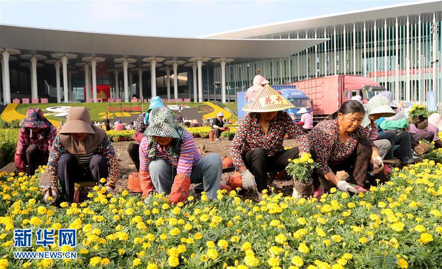 10月21日,工人们在国家会展中心(上海)南广场布置进博会鲜花装饰。 当日,第二届中国国际进口博览会国家展参展国名单公布。据悉,国家展总面积3万平方米(建筑面积),将有来自世界各地60余个国家和3个国际组织搭建展台,展示贸易投资领域的发展状况和成就。目前,进博会场馆装饰施工工作正在进行,国家会展中心(上海)将以全新面貌迎接各国嘉宾的到来。 新华社记者 方喆 摄