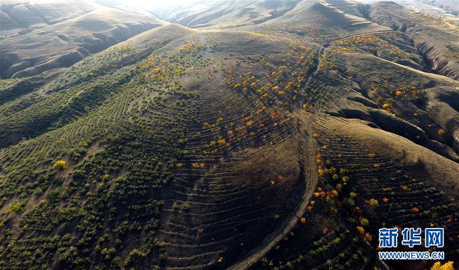 10月21日无人机拍摄的浑河岸边山坡上的秋景。 金秋时节,内蒙古和林格尔县境内的浑河两岸色彩斑斓,秋色迷人。 新华社记者 任军川 摄
