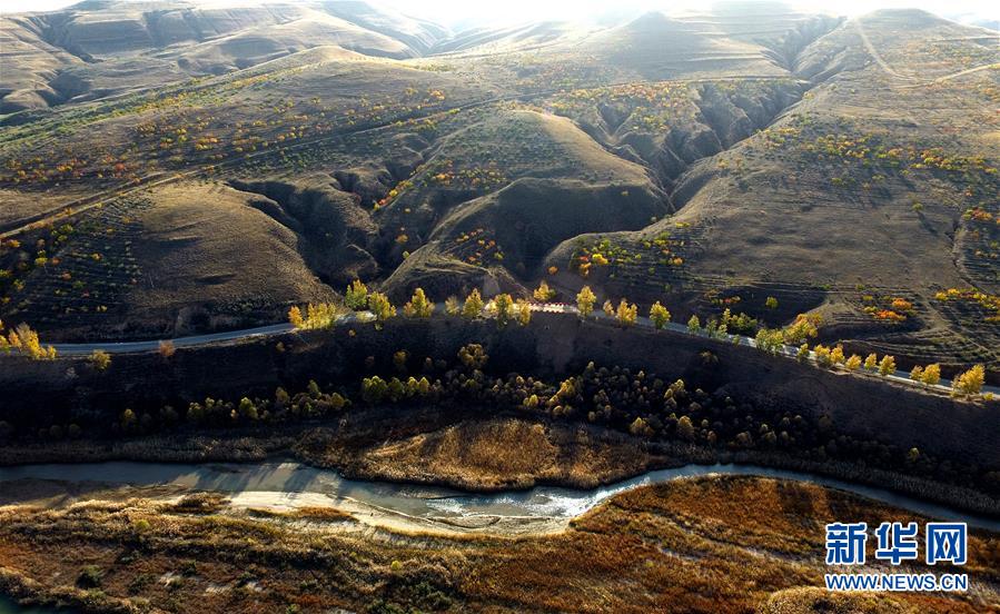 10月21日无人机拍摄的浑河岸边秋景。 金秋时节,内蒙古和林格尔县境内的浑河两岸色彩斑斓,秋色迷人。 新华社记者 任军川 摄