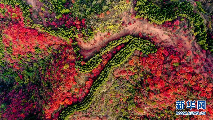 10月21日无人机拍摄的济南市红叶谷风景区一景。 金秋时节,地处山东省济南市南部山区的红叶谷风景区层林尽染,秋色绚烂。 新华社记者 郭绪雷 摄